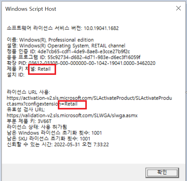 리테일 버전은 1PC용 및 재설치 가능. Volume 로 시작 하면 단체 기관용. 횟수 재발 발생 가능성 있음.